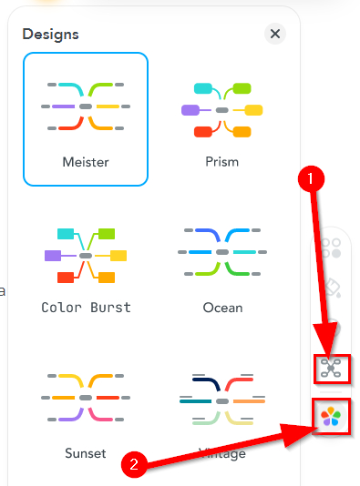 Unter "Layout" [1] kannst du das Layout der Mindmap und unter "Design" [2] das Design anpassen.
